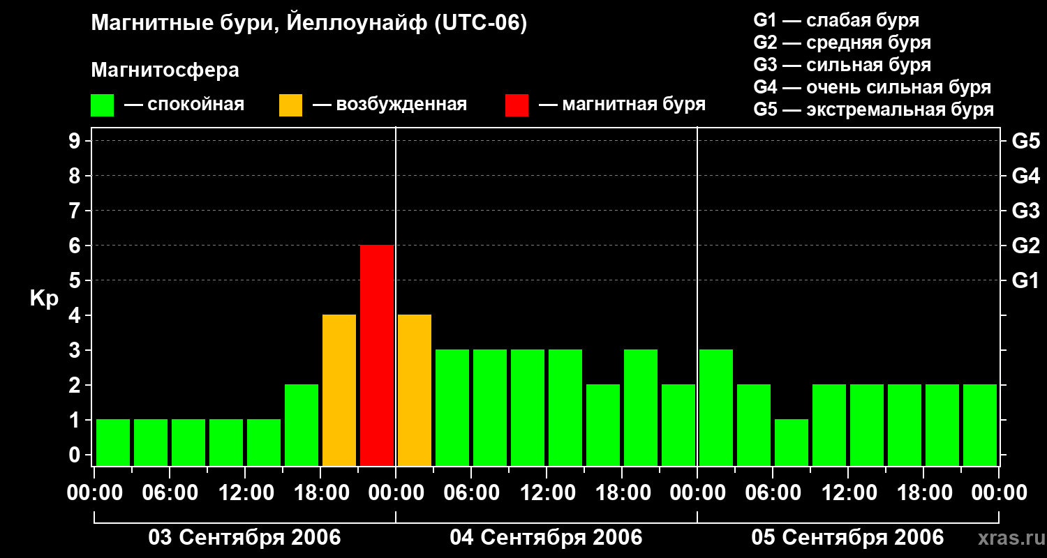 Изменения геомагнитного индекса Kp с 3 по 5 сентября 2006 года для средних широт