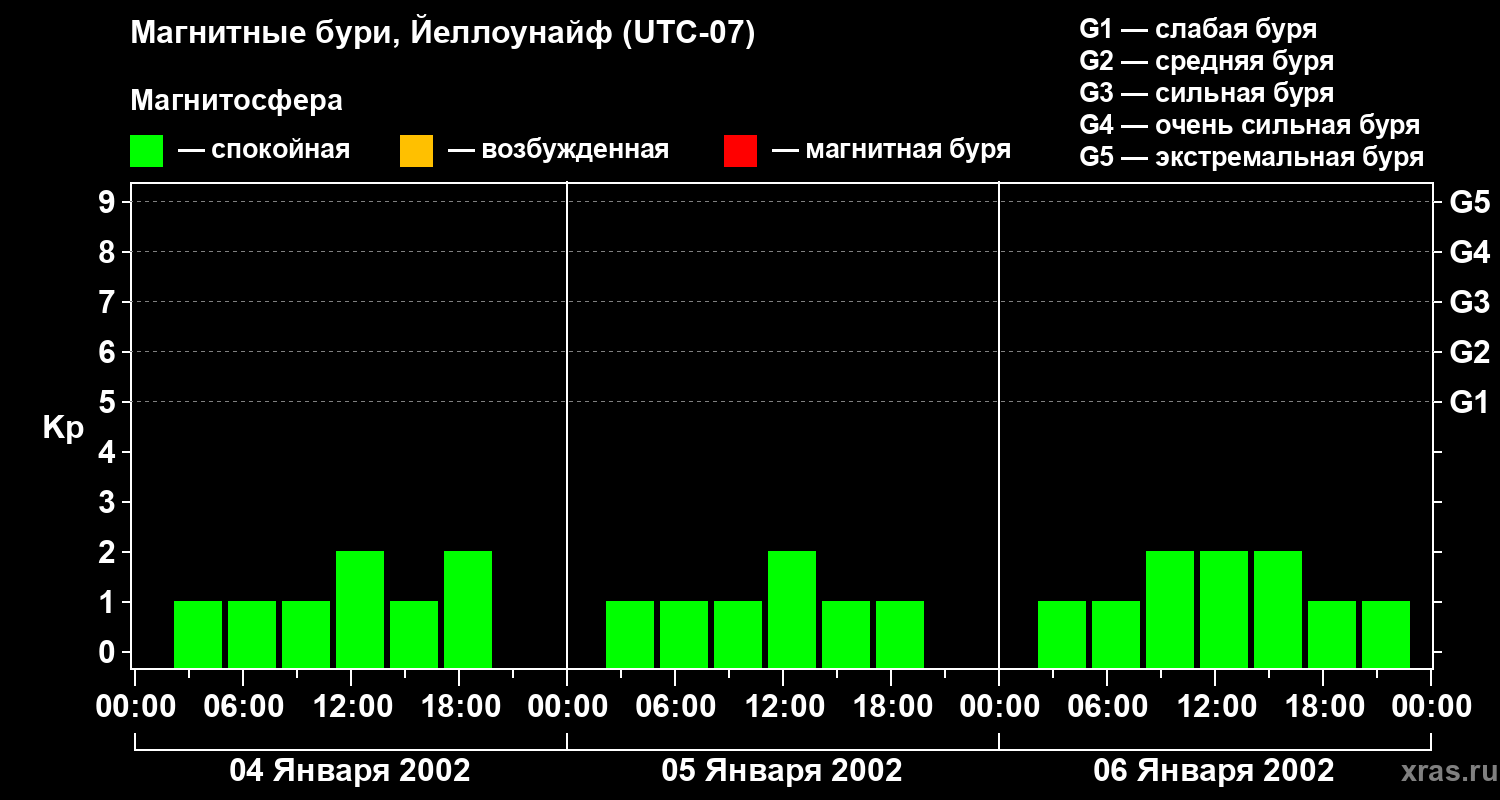 Изменения геомагнитного индекса Kp с 4 по 6 января 2002 года для средних широт