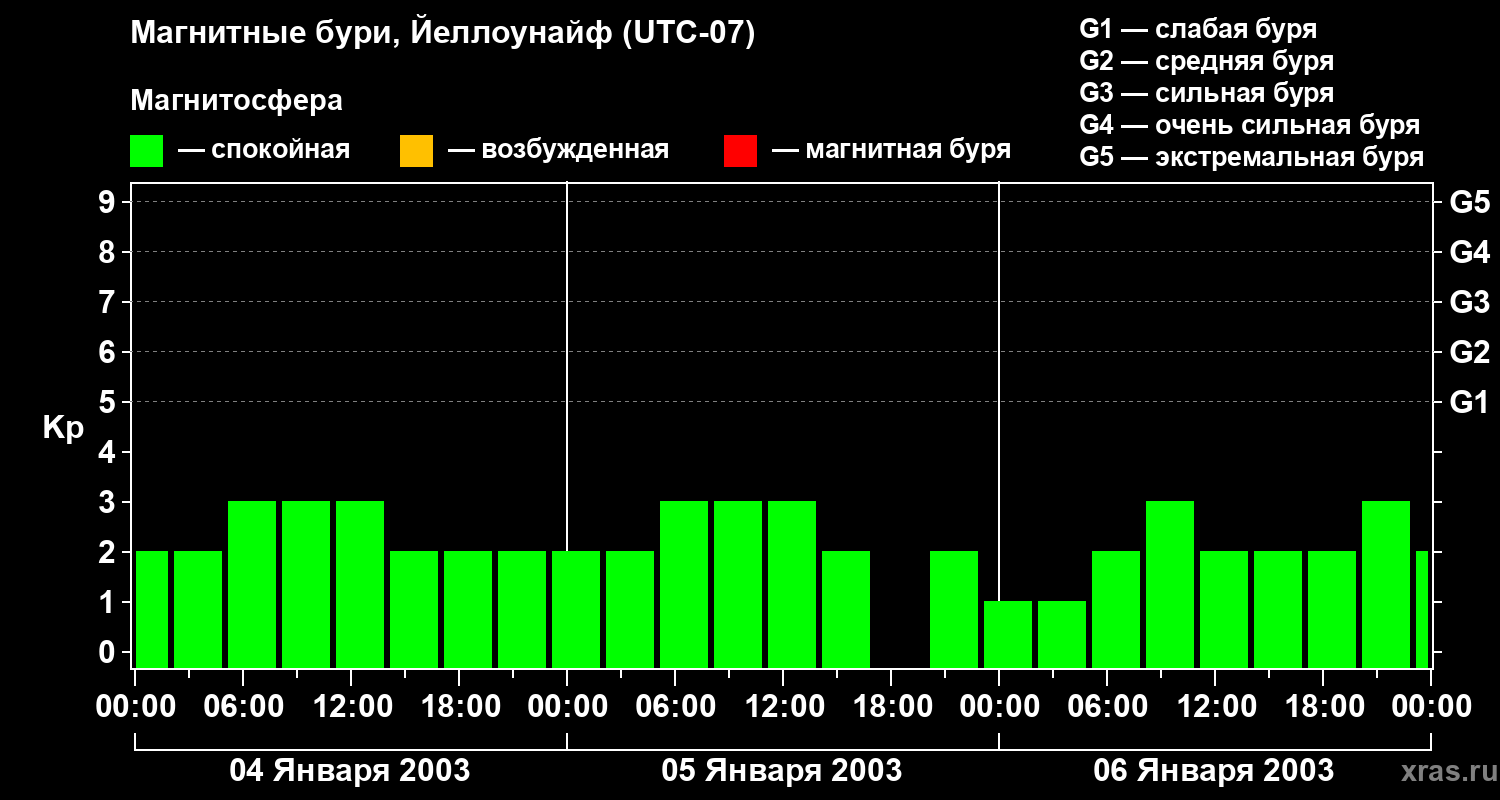 Изменения геомагнитного индекса Kp с 4 по 6 января 2003 года для средних широт