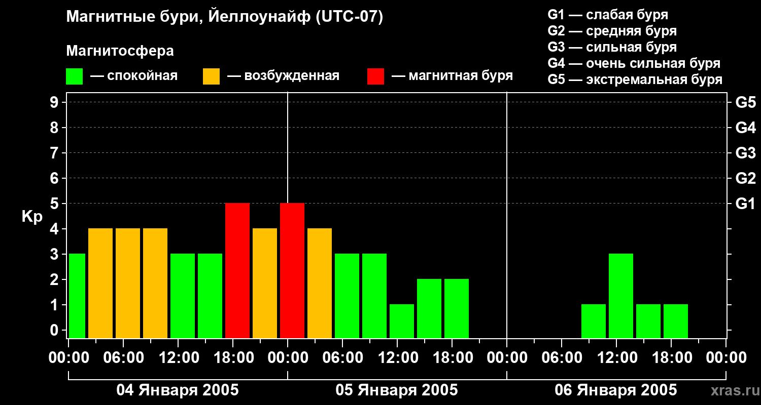 Изменения геомагнитного индекса Kp с 4 по 6 января 2005 года для средних широт