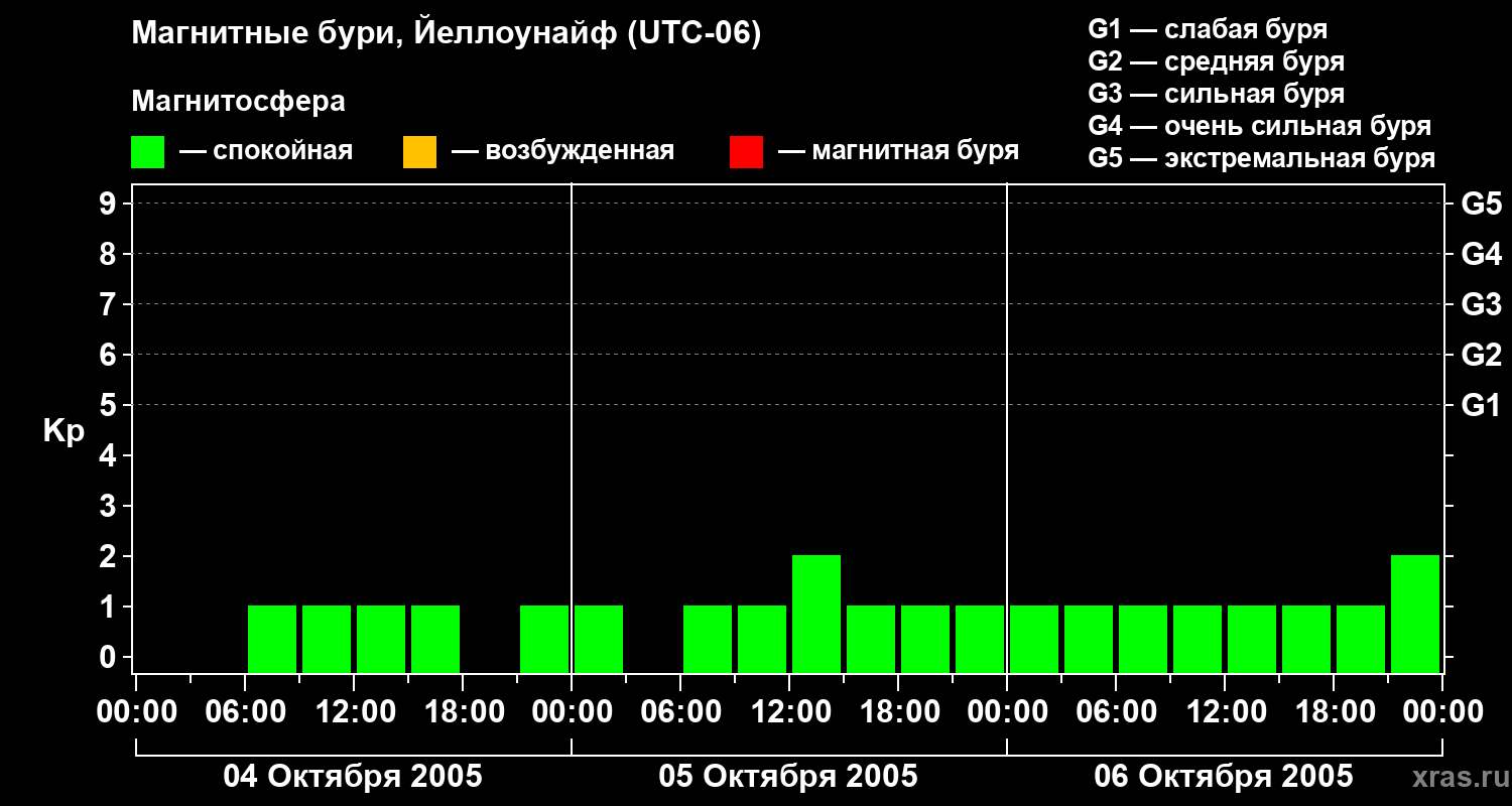 Изменения геомагнитного индекса Kp с 4 по 6 октября 2005 года для средних широт