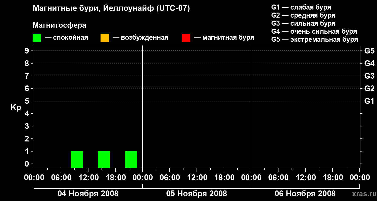 Изменения геомагнитного индекса Kp с 4 по 6 ноября 2008 года для средних широт