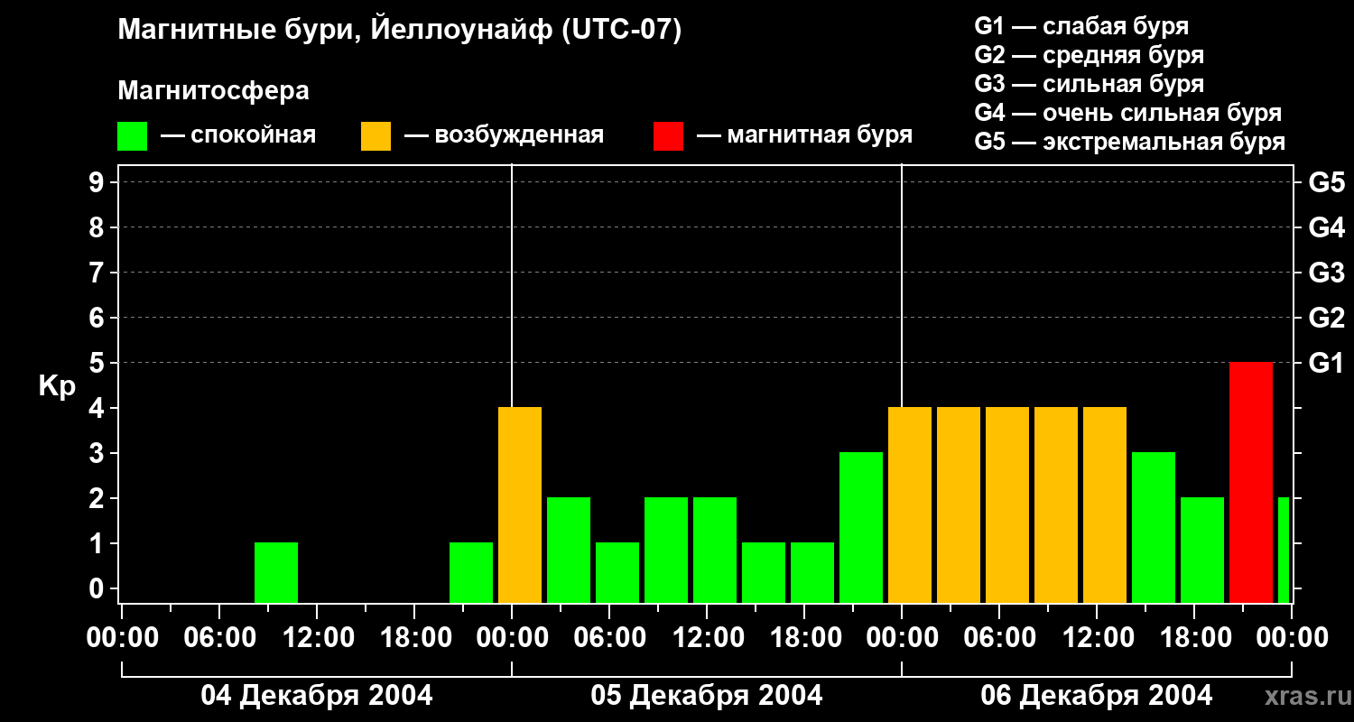 Изменения геомагнитного индекса Kp с 4 по 6 декабря 2004 года для средних широт