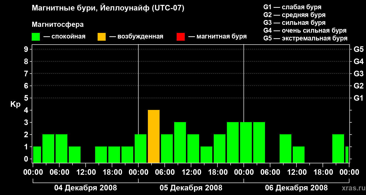 Изменения геомагнитного индекса Kp с 4 по 6 декабря 2008 года для средних широт