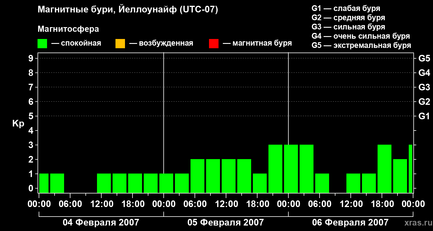 Изменения геомагнитного индекса Kp с 4 по 6 февраля 2007 года для средних широт