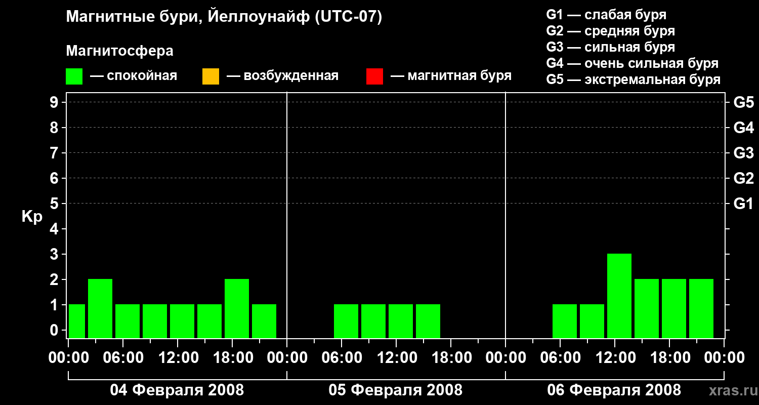 Изменения геомагнитного индекса Kp с 4 по 6 февраля 2008 года для средних широт