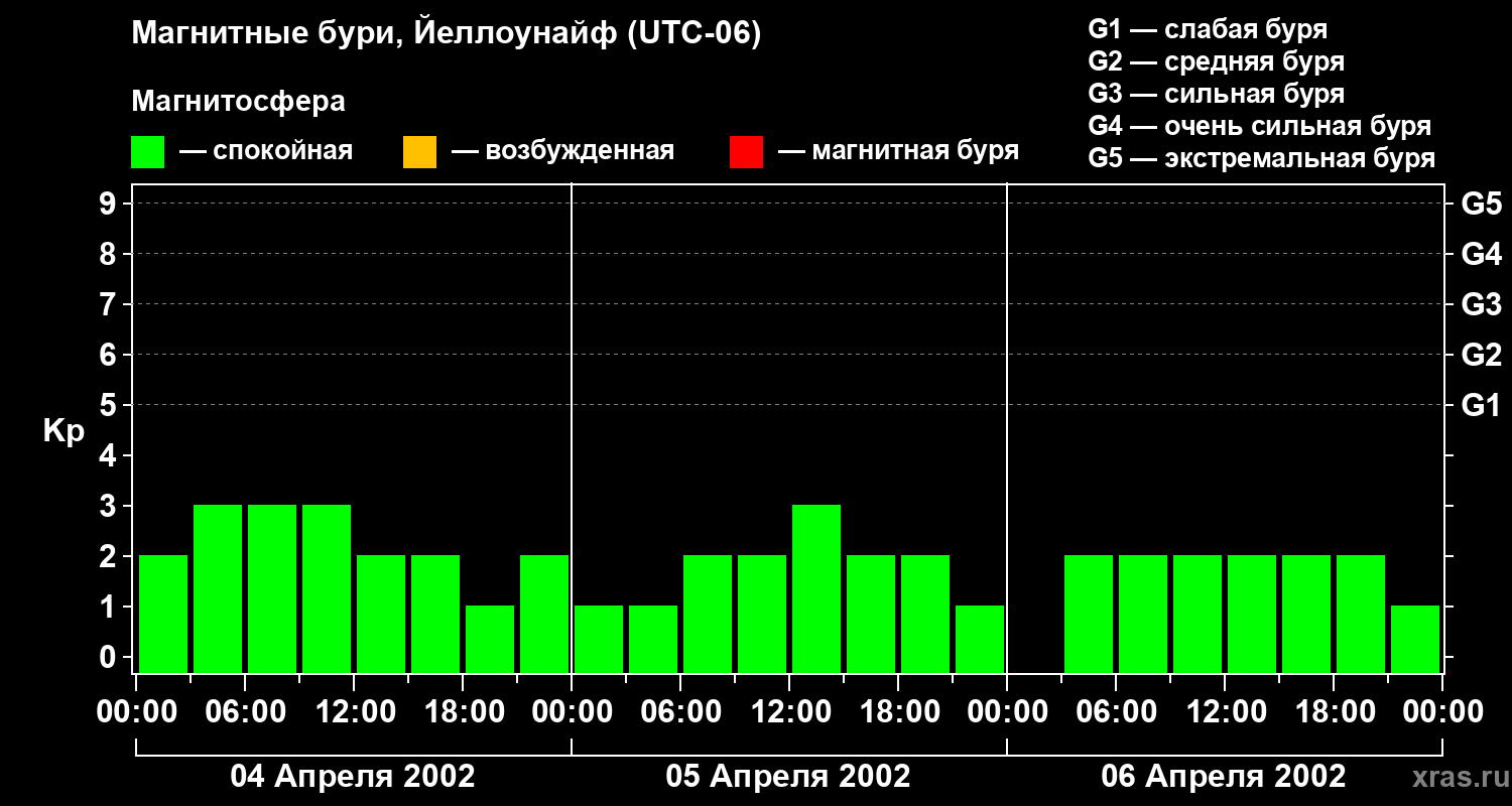 Изменения геомагнитного индекса Kp с 4 по 6 апреля 2002 года для средних широт