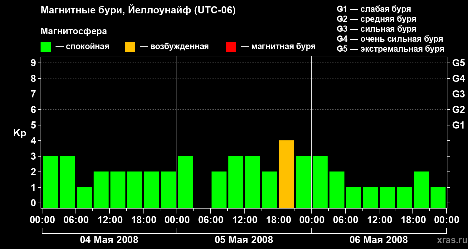 Изменения геомагнитного индекса Kp с 4 по 6 мая 2008 года для средних широт