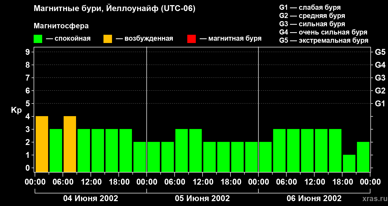 Изменения геомагнитного индекса Kp с 4 по 6 июня 2002 года для средних широт