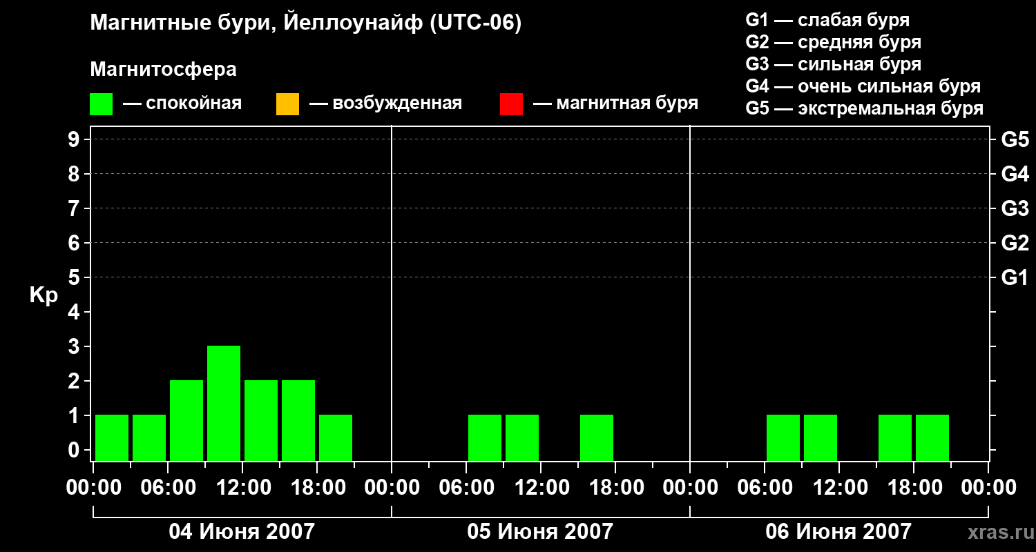 Изменения геомагнитного индекса Kp с 4 по 6 июня 2007 года для средних широт