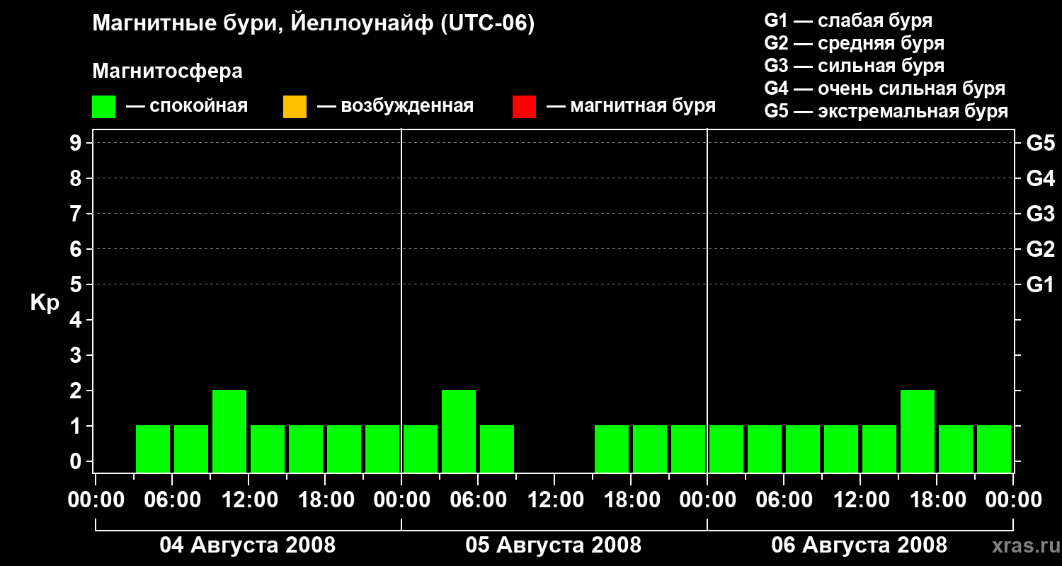 Изменения геомагнитного индекса Kp с 4 по 6 августа 2008 года для средних широт