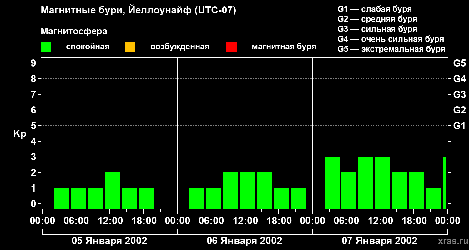 Изменения геомагнитного индекса Kp с 5 по 7 января 2002 года для средних широт