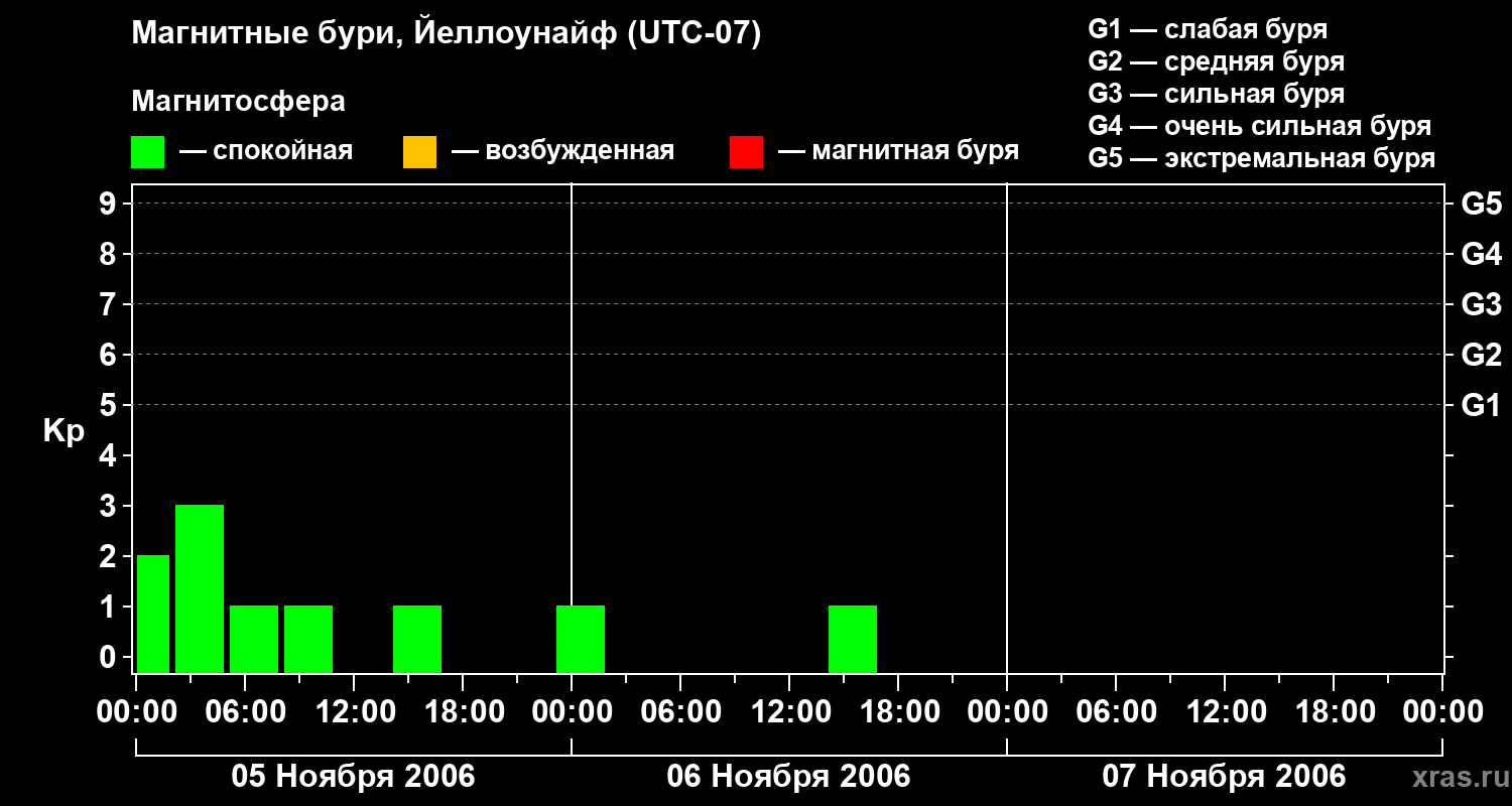 Изменения геомагнитного индекса Kp с 5 по 7 ноября 2006 года для средних широт