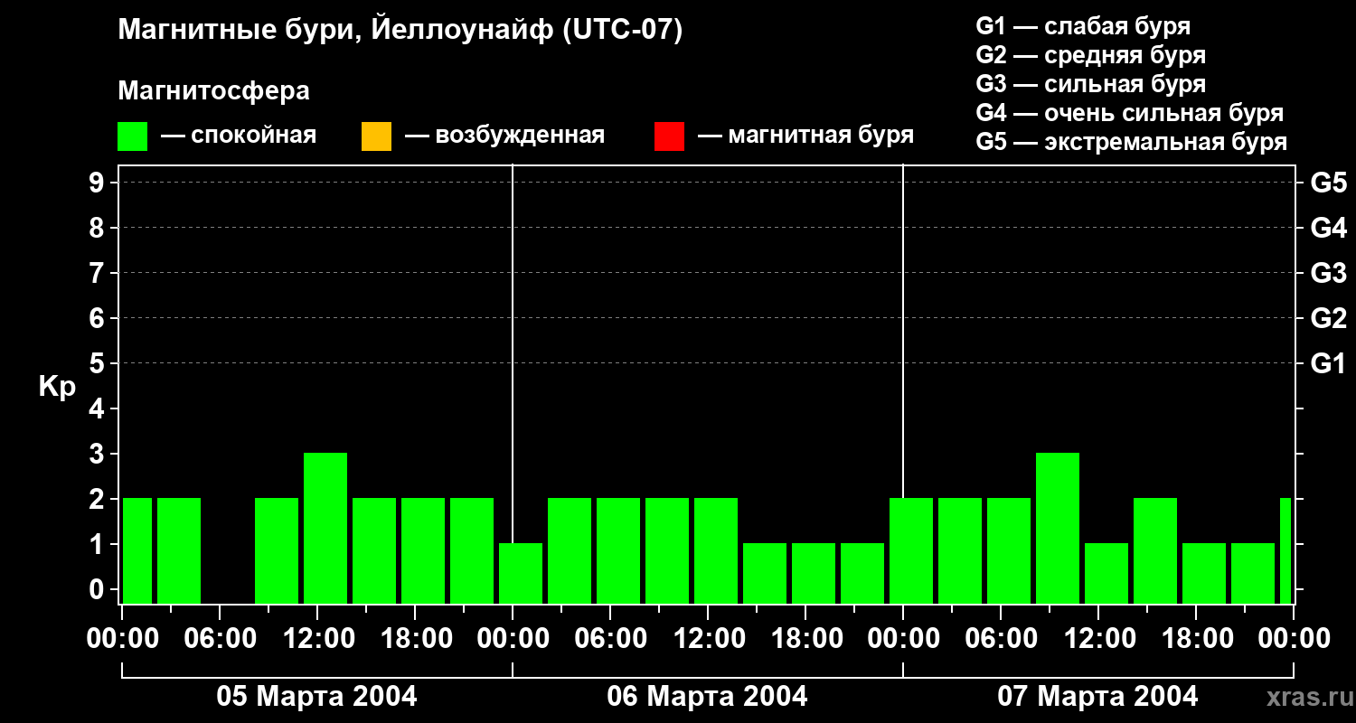 Изменения геомагнитного индекса Kp с 5 по 7 марта 2004 года для средних широт