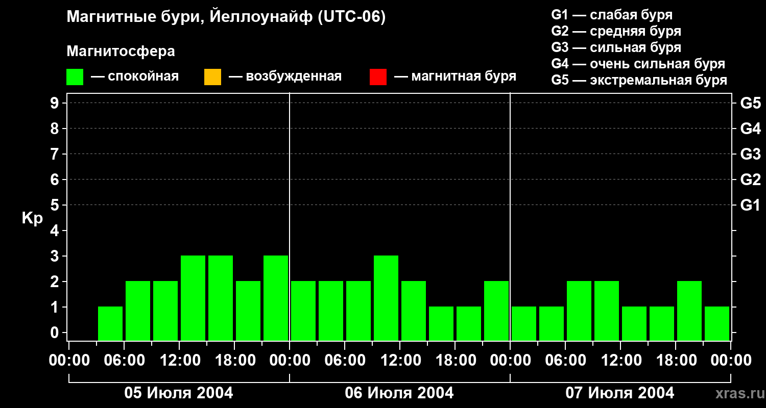 Изменения геомагнитного индекса Kp с 5 по 7 июля 2004 года для средних широт