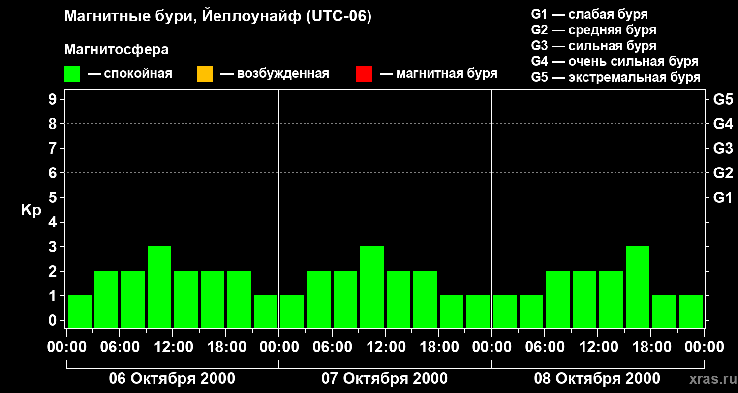 Изменения геомагнитного индекса Kp с 6 по 8 октября 2000 года для средних широт