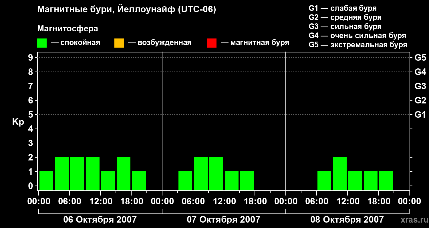 Изменения геомагнитного индекса Kp с 6 по 8 октября 2007 года для средних широт