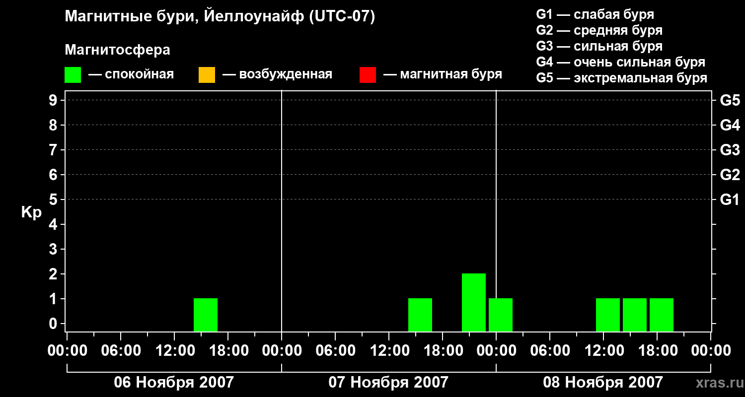Изменения геомагнитного индекса Kp с 6 по 8 ноября 2007 года для средних широт