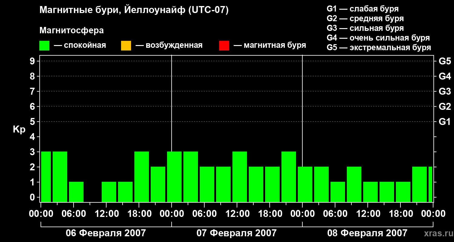 Изменения геомагнитного индекса Kp с 6 по 8 февраля 2007 года для средних широт