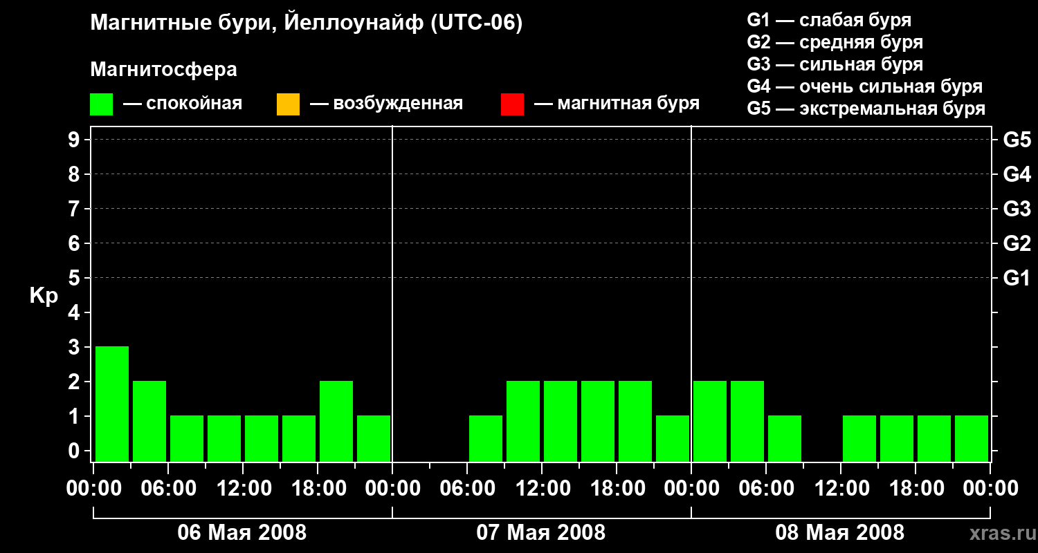 Изменения геомагнитного индекса Kp с 6 по 8 мая 2008 года для средних широт