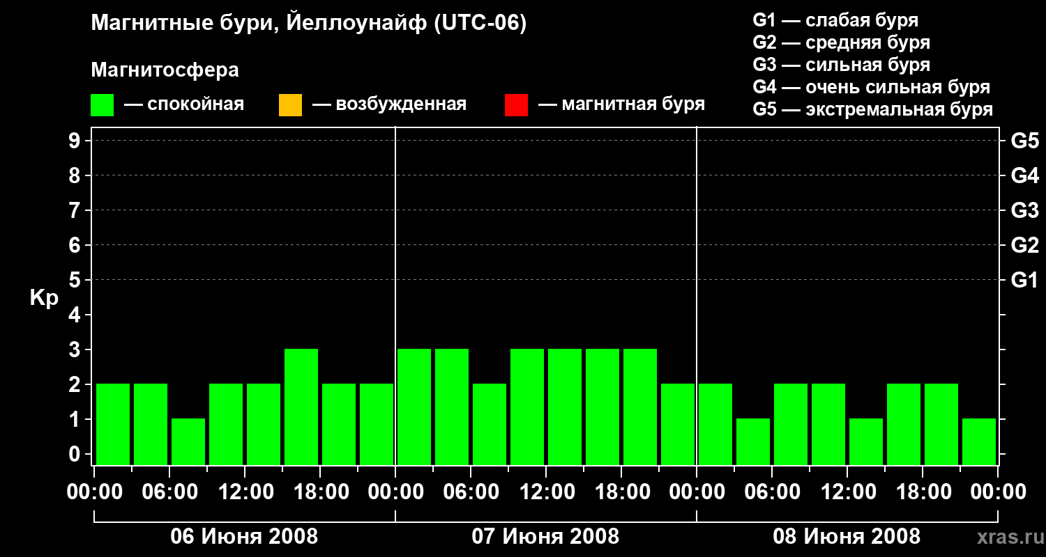 Изменения геомагнитного индекса Kp с 6 по 8 июня 2008 года для средних широт