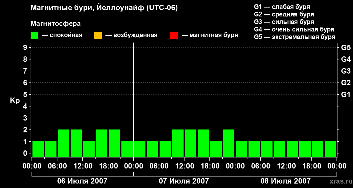 Изменения геомагнитного индекса Kp с 6 по 8 июля 2007 года для средних широт