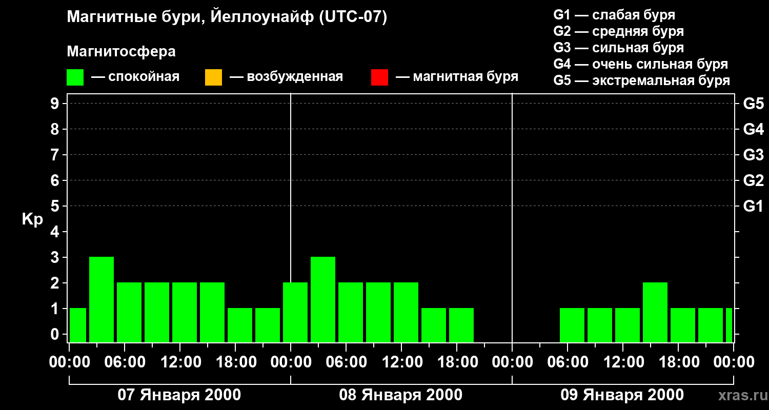 Изменения геомагнитного индекса Kp с 7 по 9 января 2000 года для средних широт