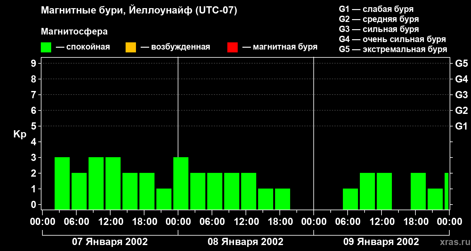 Изменения геомагнитного индекса Kp с 7 по 9 января 2002 года для средних широт