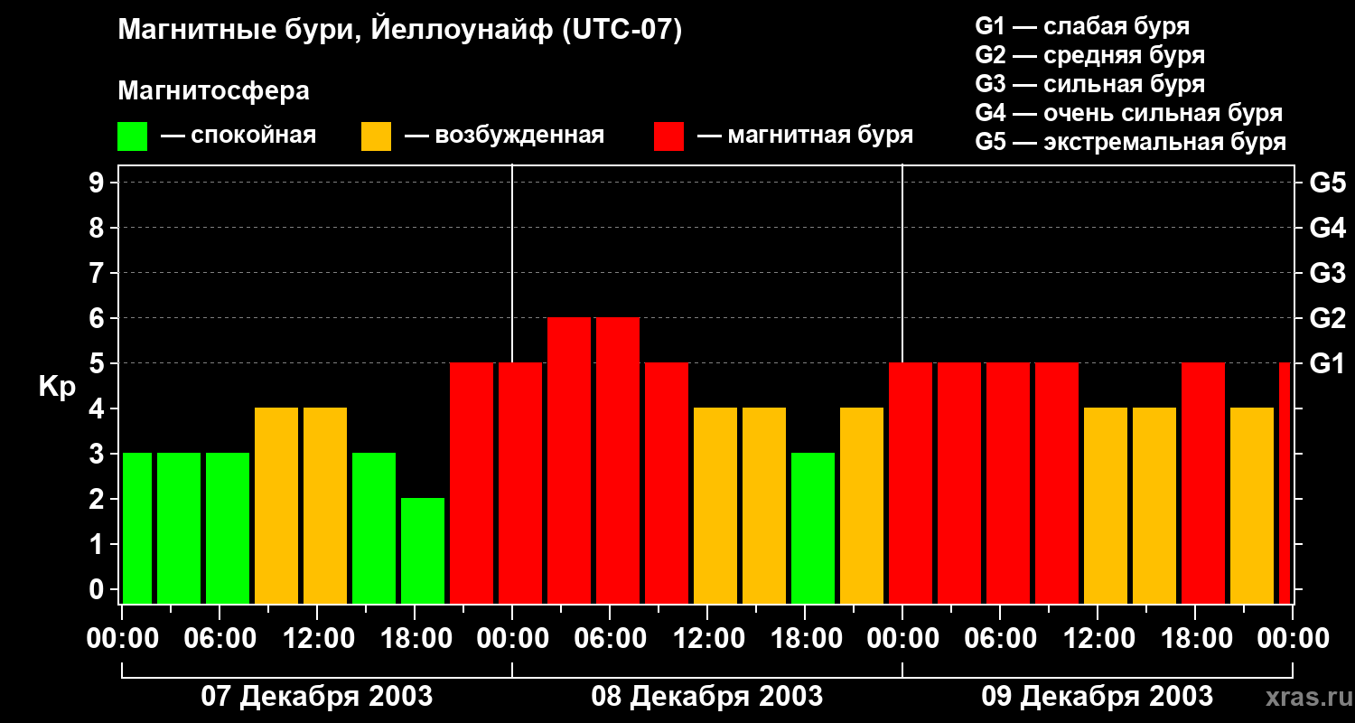 Изменения геомагнитного индекса Kp с 7 по 9 декабря 2003 года для средних широт