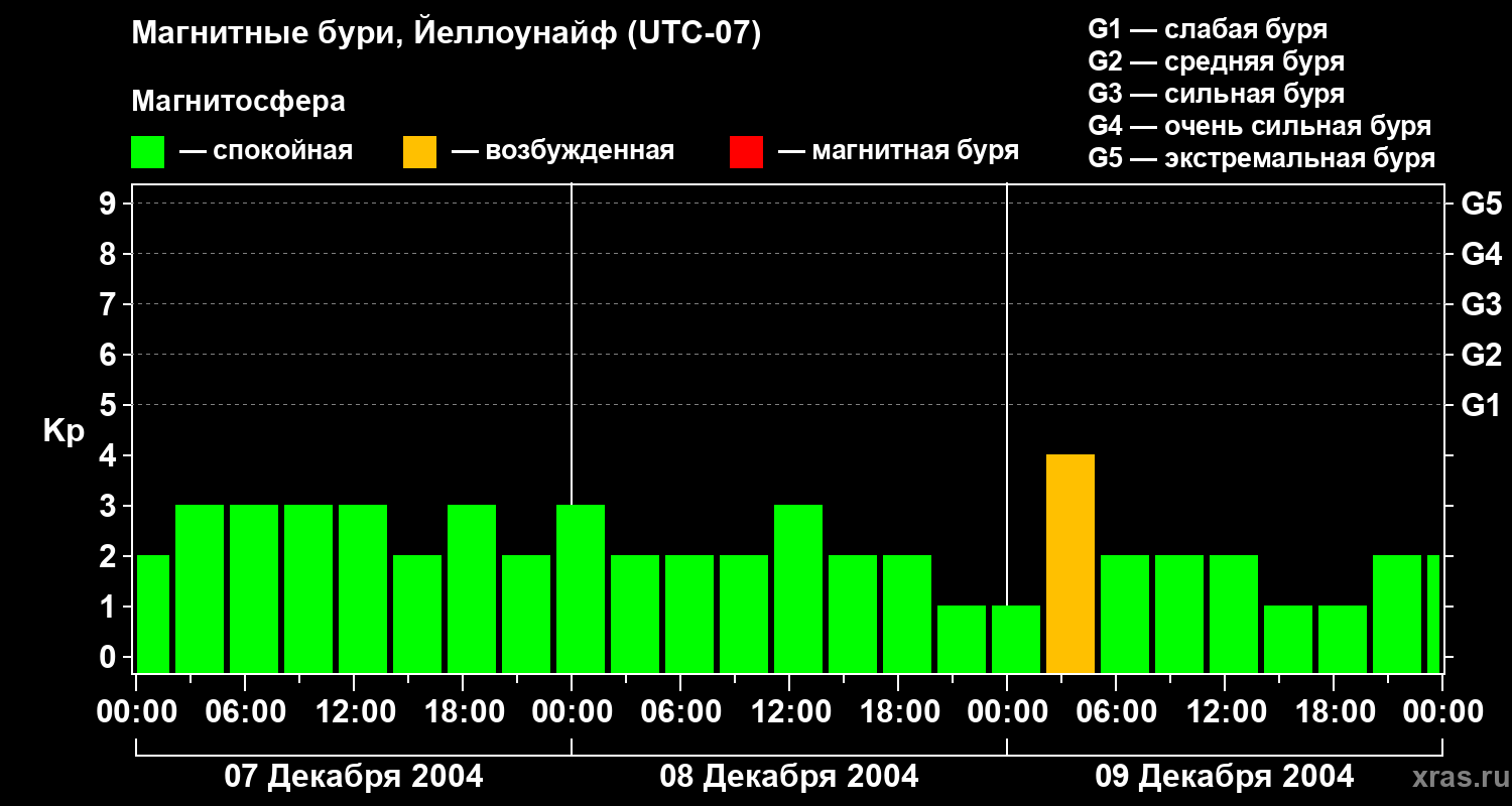 Изменения геомагнитного индекса Kp с 7 по 9 декабря 2004 года для средних широт