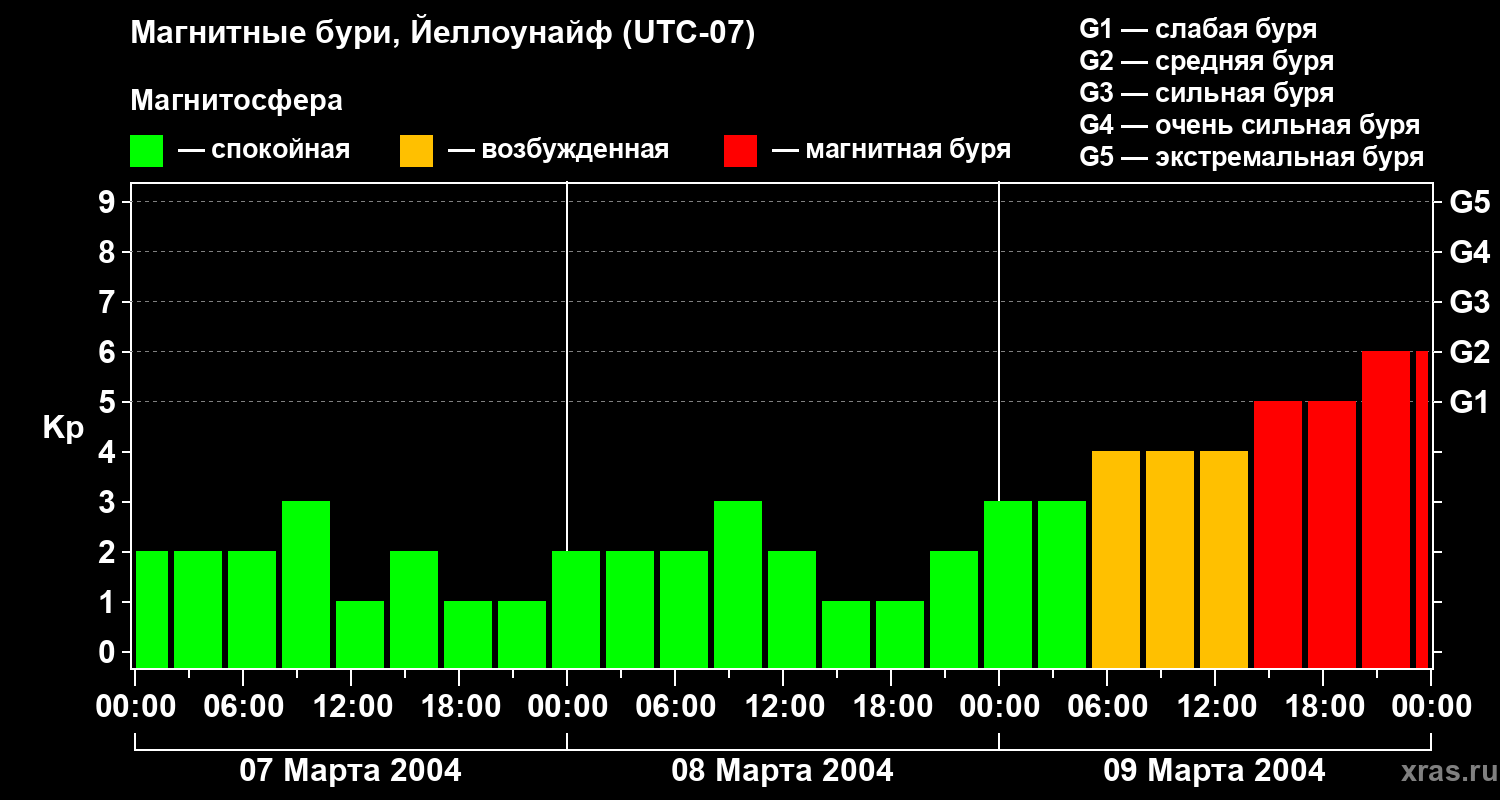 Изменения геомагнитного индекса Kp с 7 по 9 марта 2004 года для средних широт