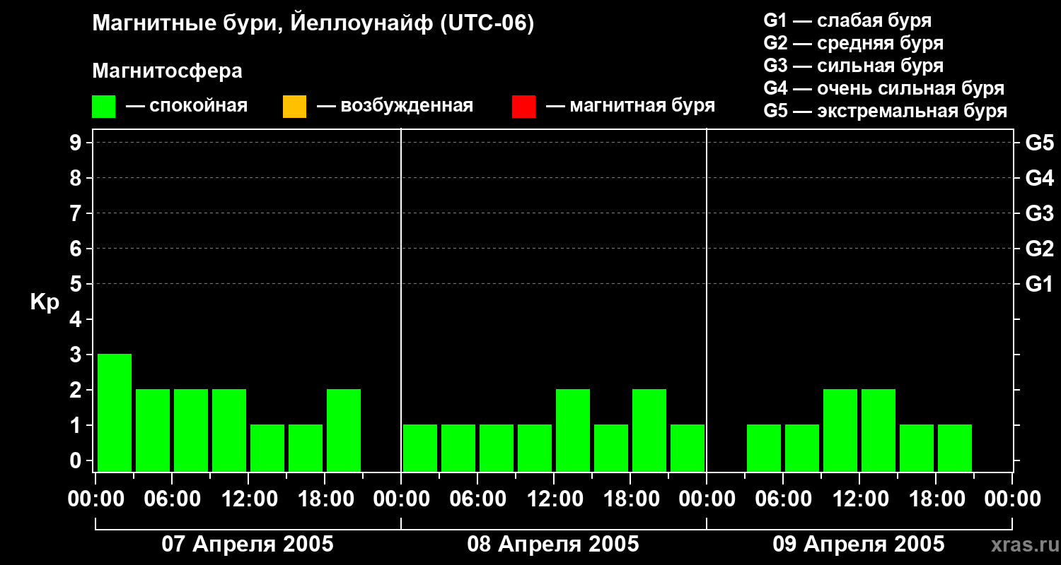Изменения геомагнитного индекса Kp с 7 по 9 апреля 2005 года для средних широт