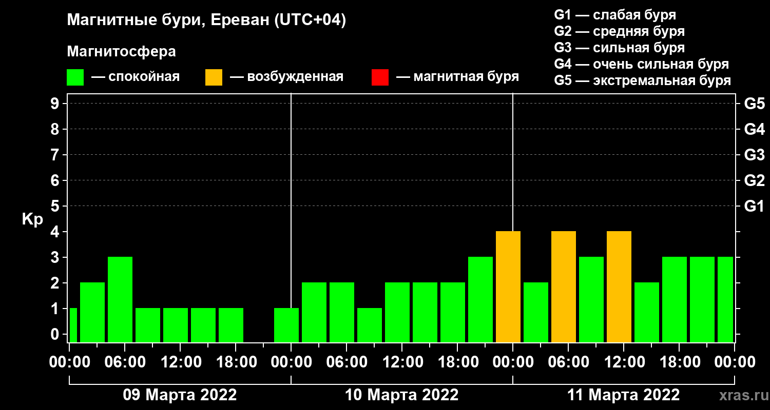 Изменения геомагнитного индекса Kp с 9 по 11 марта 2022 года для средних широт