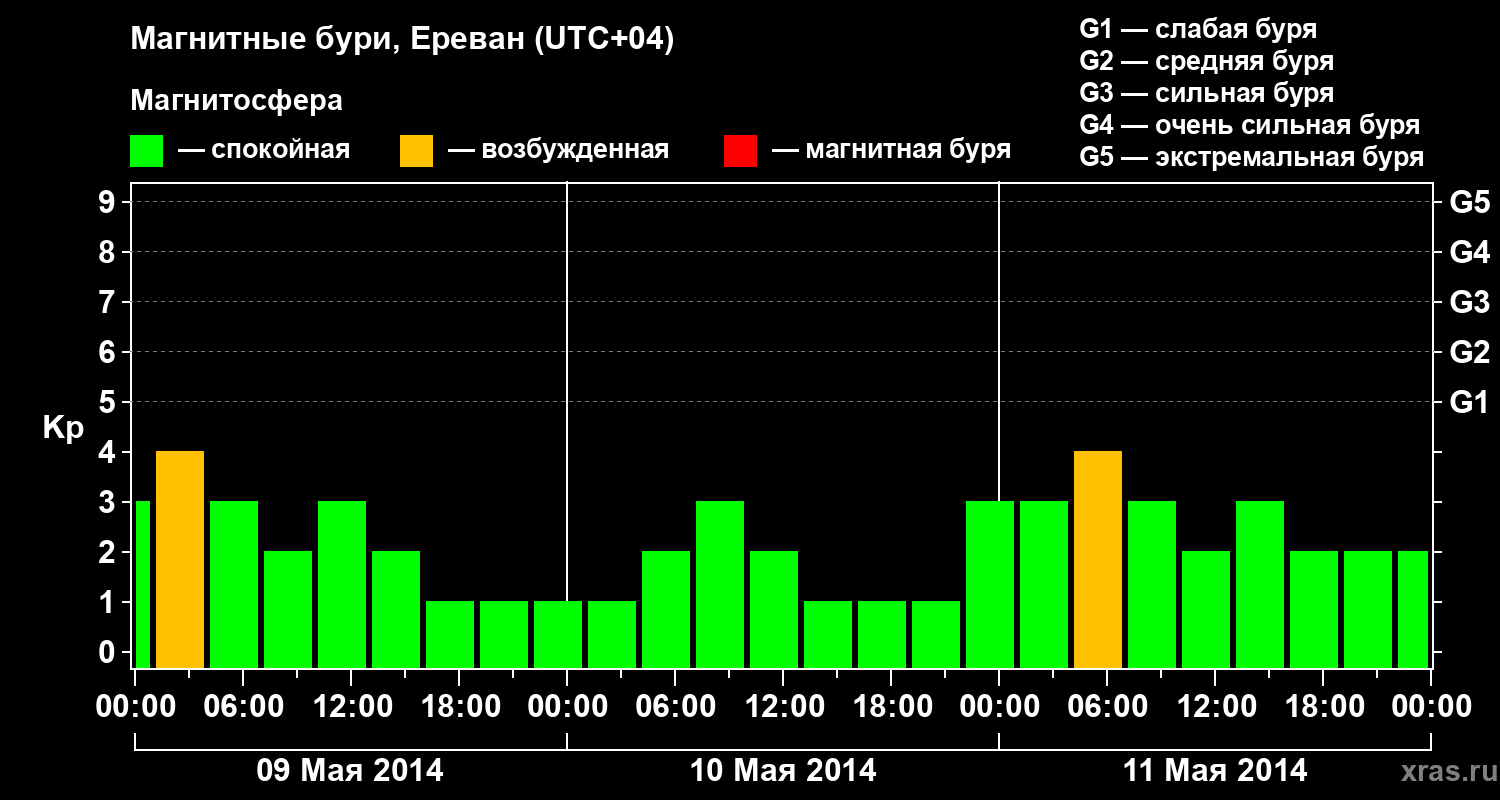 Изменения геомагнитного индекса Kp с 9 по 11 мая 2014 года для средних широт