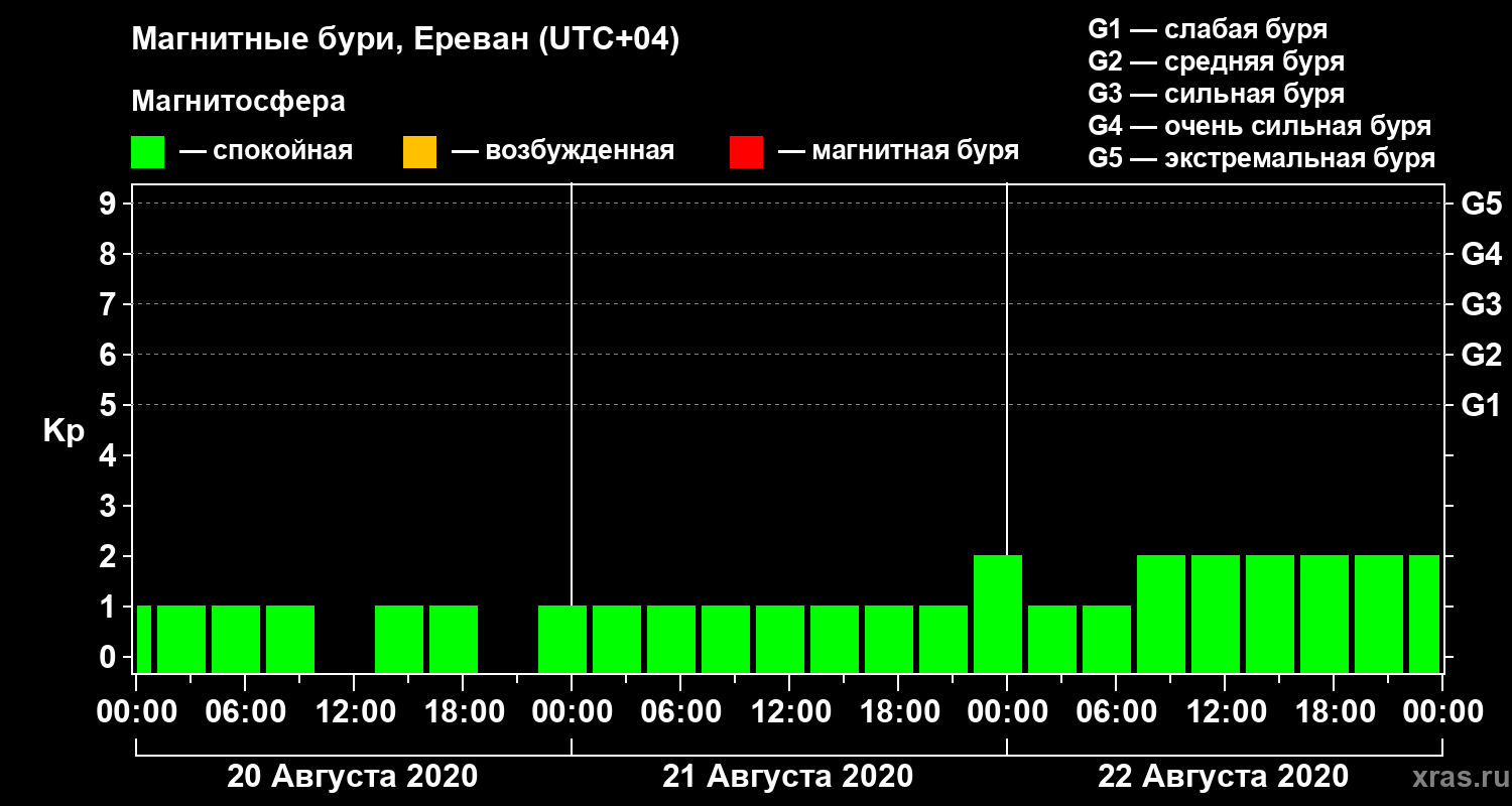 Изменения геомагнитного индекса Kp с 20 по 22 августа 2020 года для средних широт