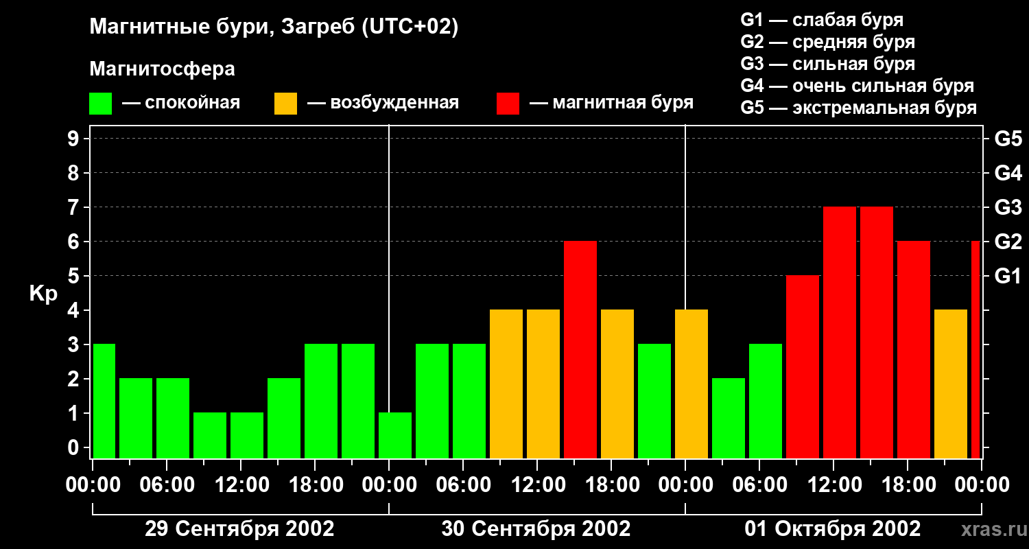 Изменения геомагнитного индекса Kp с 29 сентября по 1 октября 2002 года для средних широт