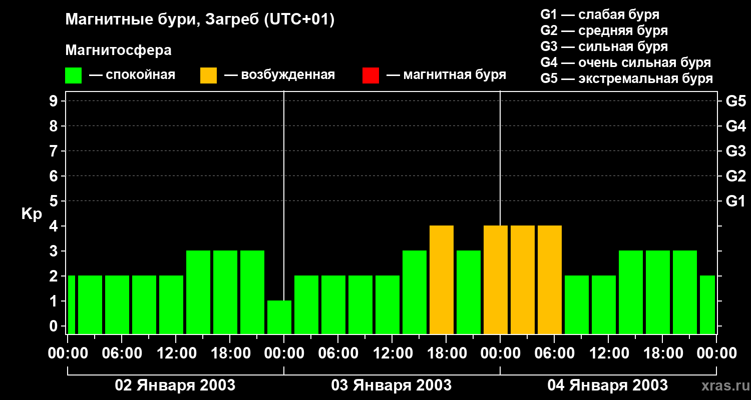 Изменения геомагнитного индекса Kp с 2 по 4 января 2003 года для средних широт