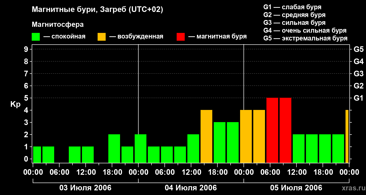 Изменения геомагнитного индекса Kp с 3 по 5 июля 2006 года для средних широт