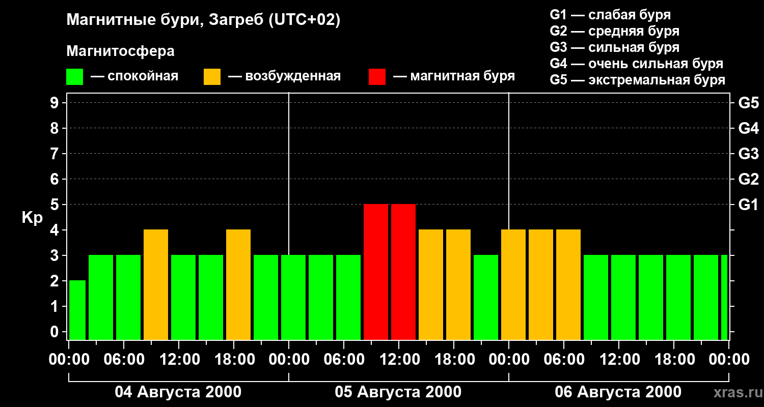 Изменения геомагнитного индекса Kp с 4 по 6 августа 2000 года для средних широт