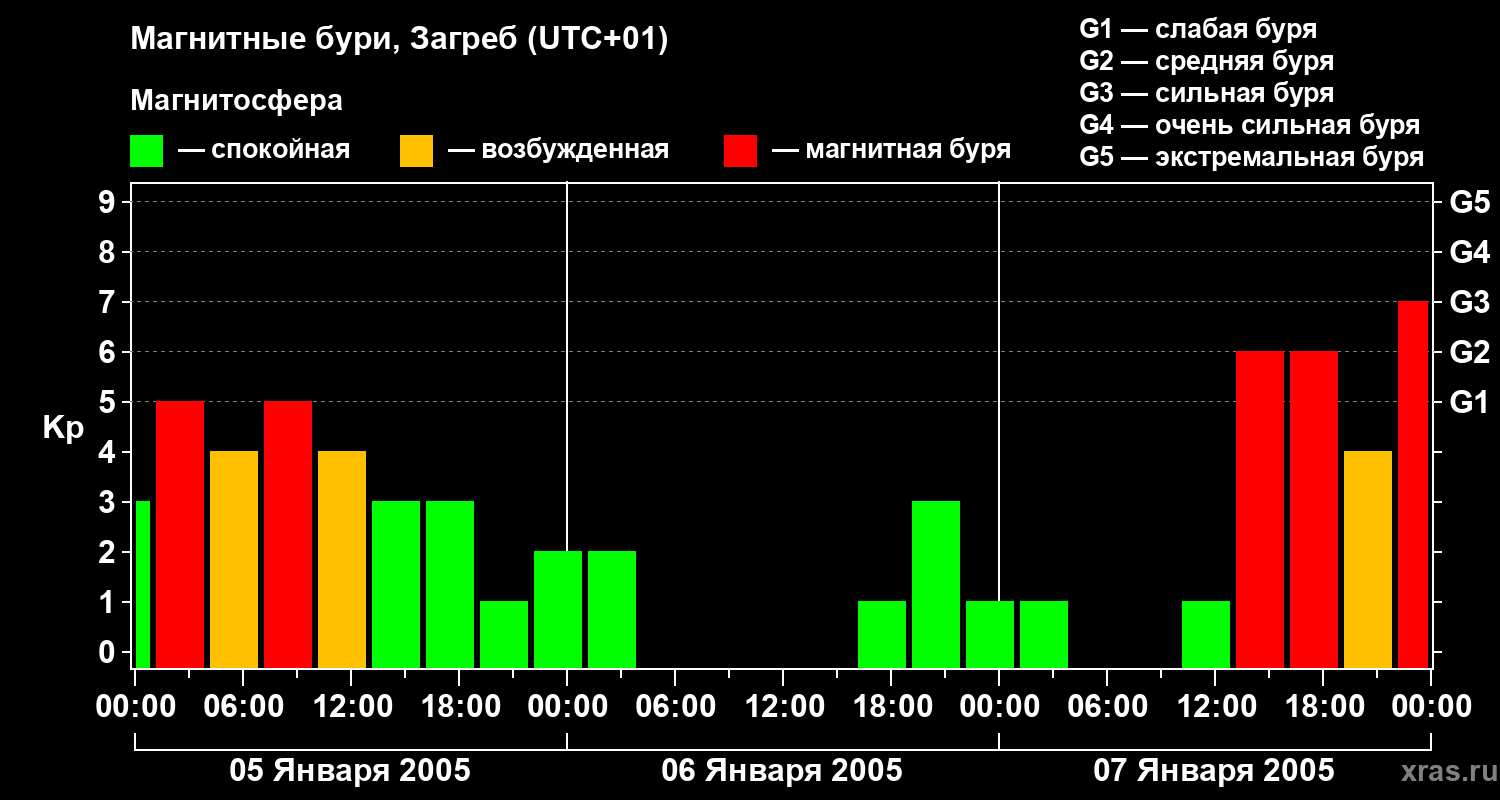 Изменения геомагнитного индекса Kp с 5 по 7 января 2005 года для средних широт