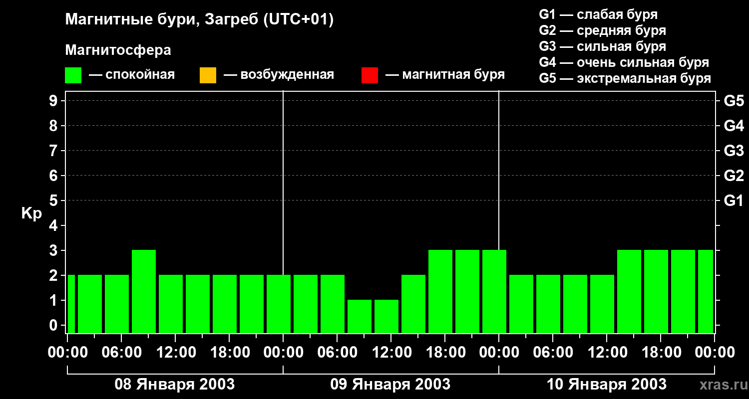 Изменения геомагнитного индекса Kp с 8 по 10 января 2003 года для средних широт