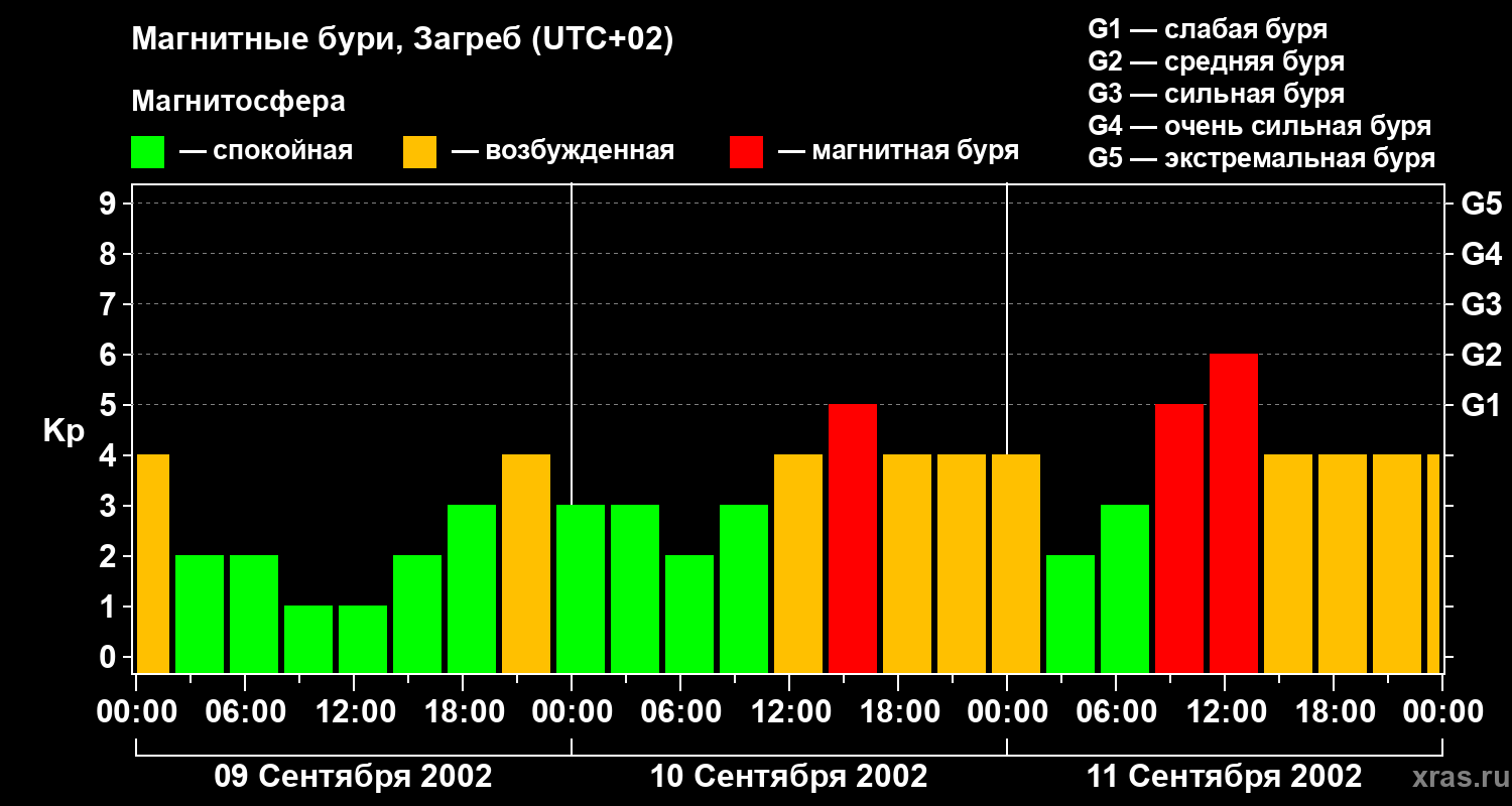 Изменения геомагнитного индекса Kp с 9 по 11 сентября 2002 года для средних широт