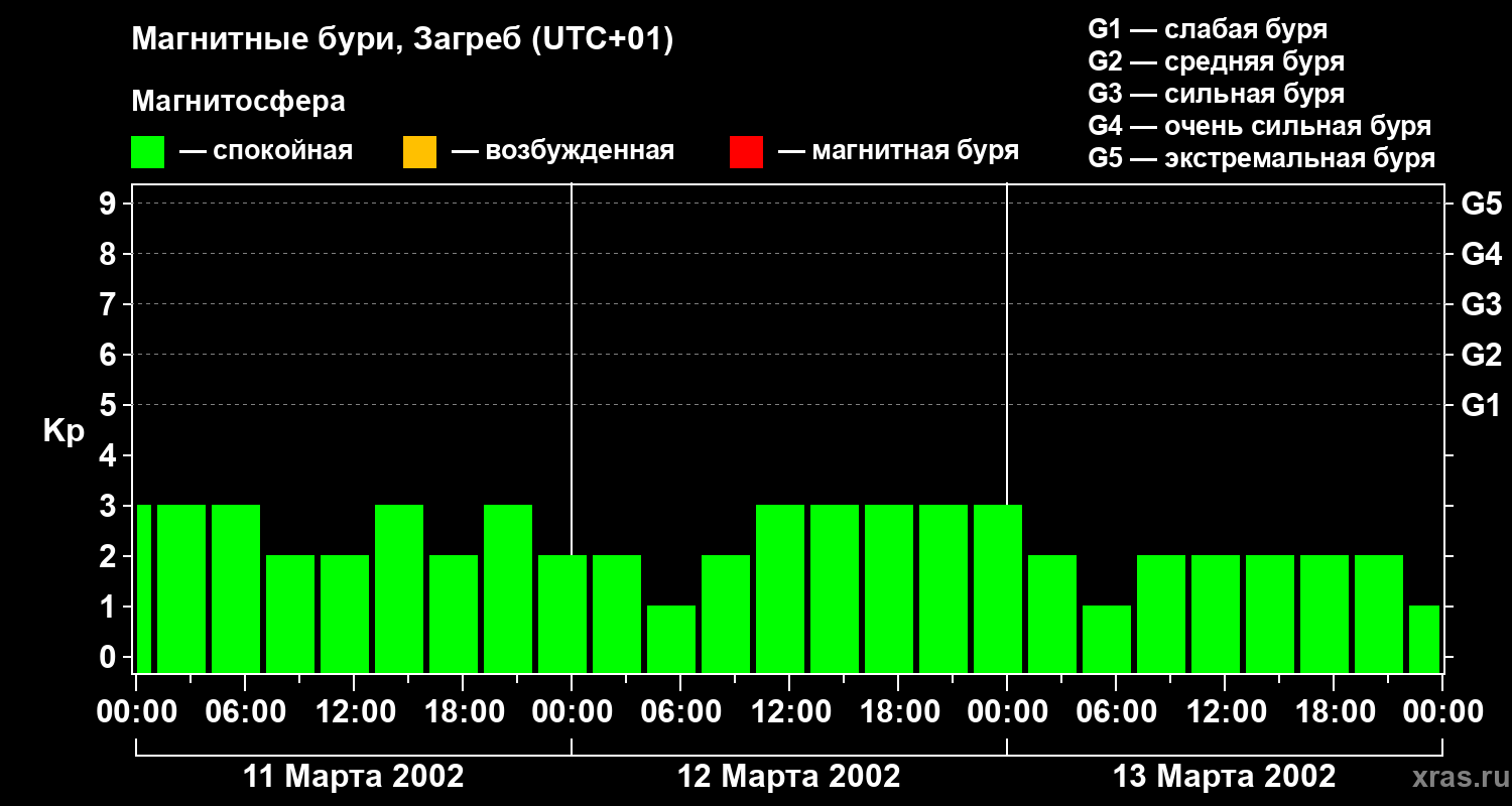 Изменения геомагнитного индекса Kp с 11 по 13 марта 2002 года для средних широт