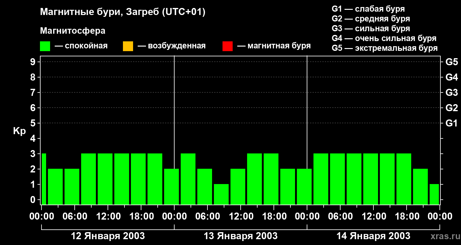 Изменения геомагнитного индекса Kp с 12 по 14 января 2003 года для средних широт