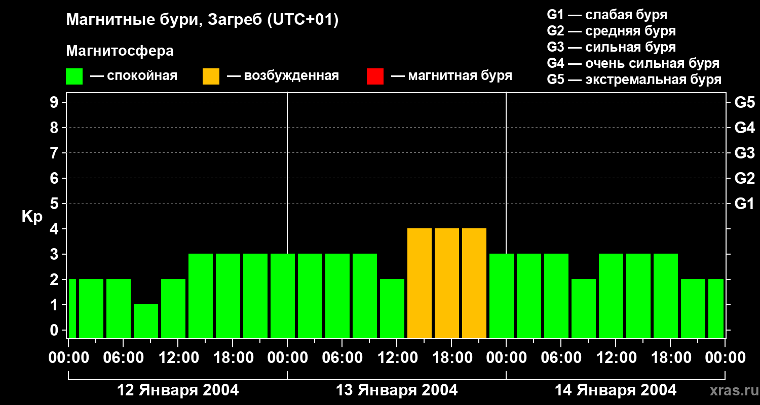 Изменения геомагнитного индекса Kp с 12 по 14 января 2004 года для средних широт