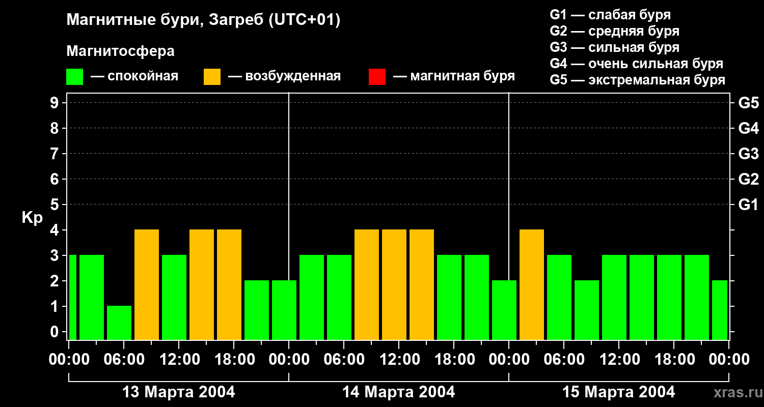 Изменения геомагнитного индекса Kp с 13 по 15 марта 2004 года для средних широт