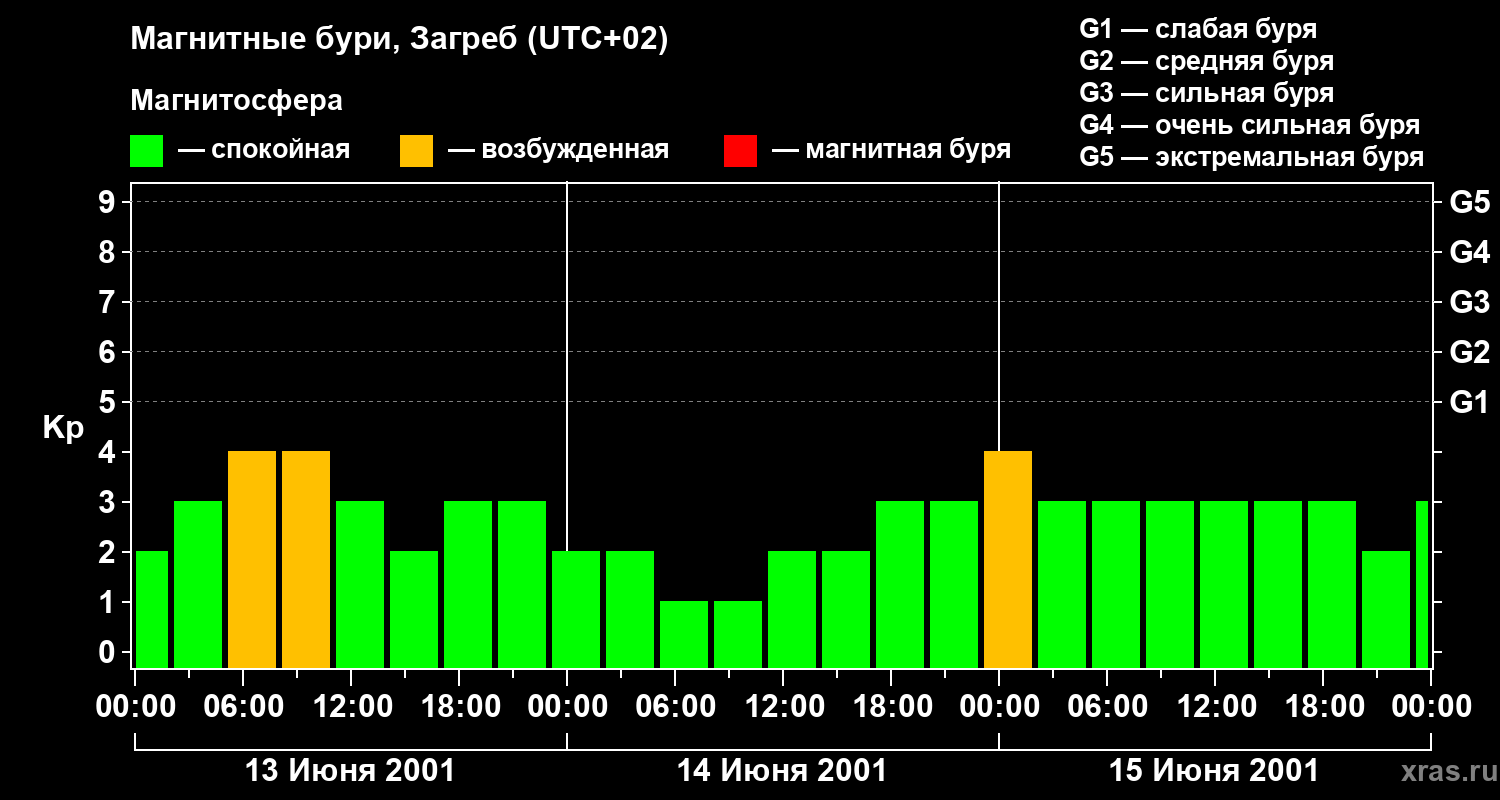 Изменения геомагнитного индекса Kp с 13 по 15 июня 2001 года для средних широт