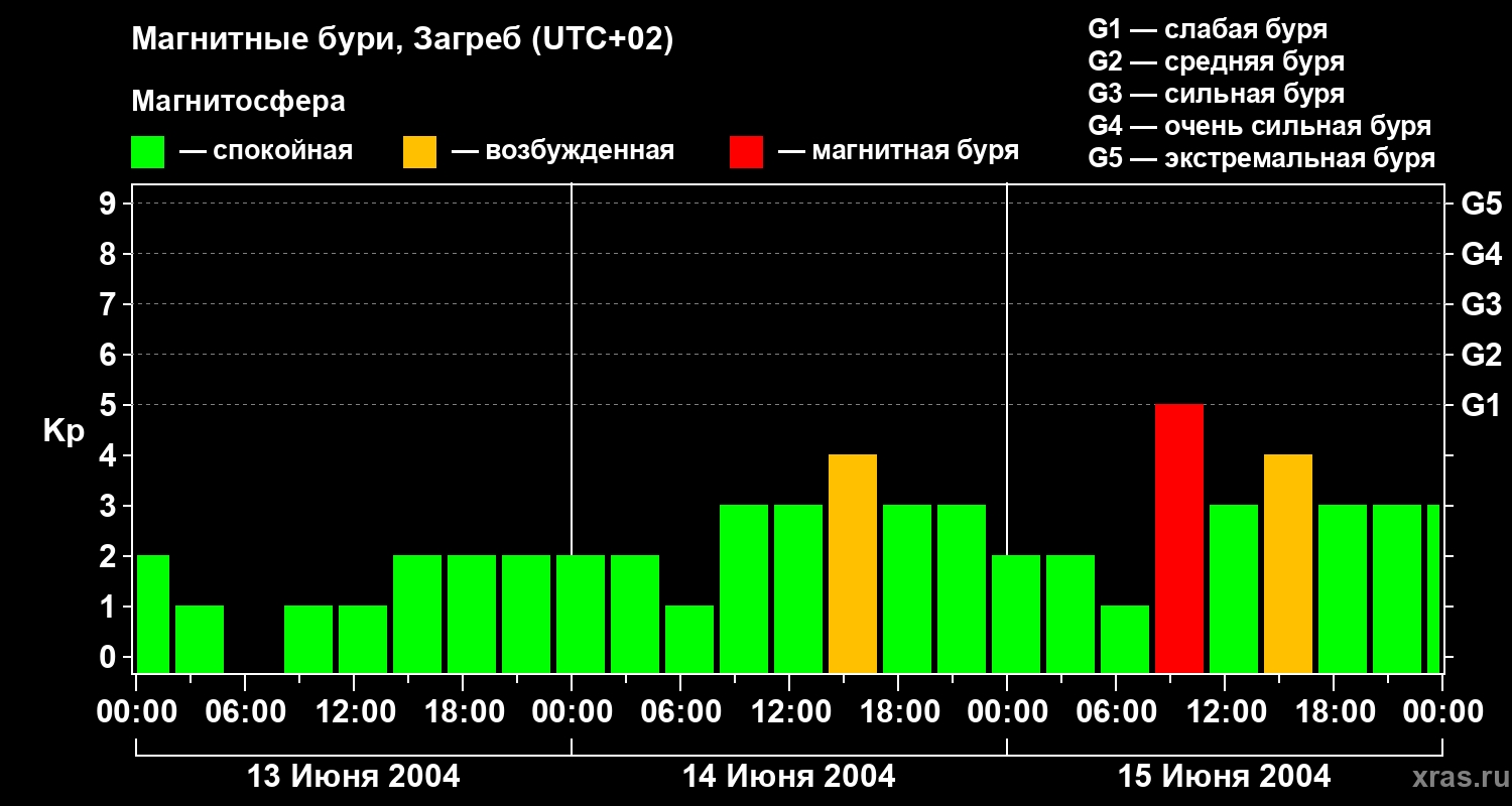 Изменения геомагнитного индекса Kp с 13 по 15 июня 2004 года для средних широт