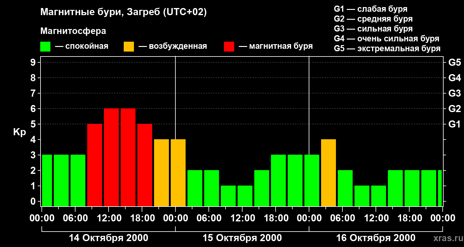 Изменения геомагнитного индекса Kp с 14 по 16 октября 2000 года для средних широт