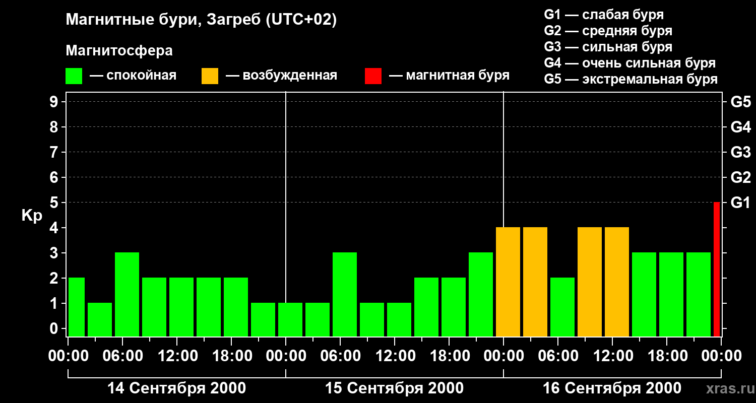 Изменения геомагнитного индекса Kp с 14 по 16 сентября 2000 года для средних широт